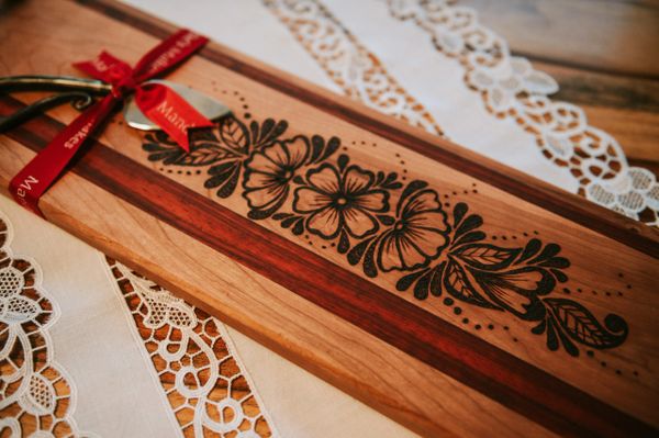 I draw and burn designs onto Cheese Boards, Platters, Trays, Boxes and Wood items of all shapes and sizes. I do custom designs for Weddings or Christmas, check out the Photo Gallery for examples of all the items i have created.